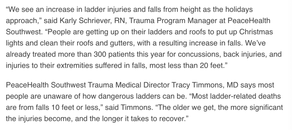 There is a huge up-tick in ladder-related injuries in Washington state every winter at the holidays. Putting up Christmas lights is dangerous.